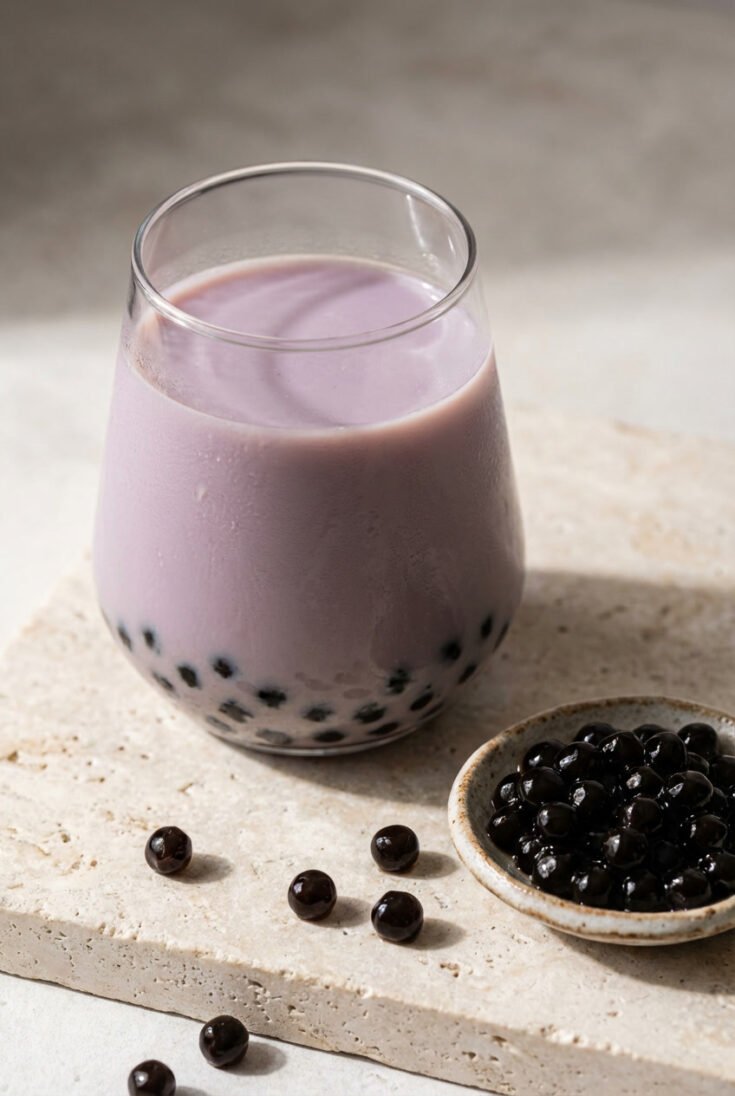 I use taro powder for the classic flavor, tapioca pearls (the usual black boba you get in shops) for the chewy texture, and a shaker to help the powder mix in properly. If you are serving it with boba, wide straws are worth having too.